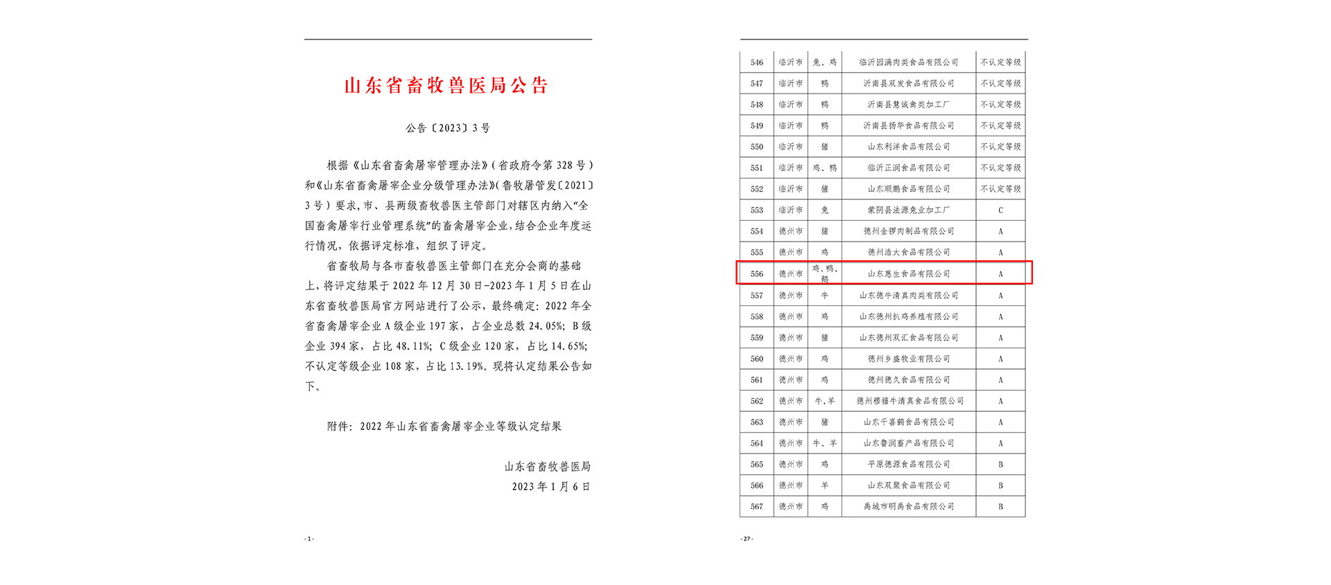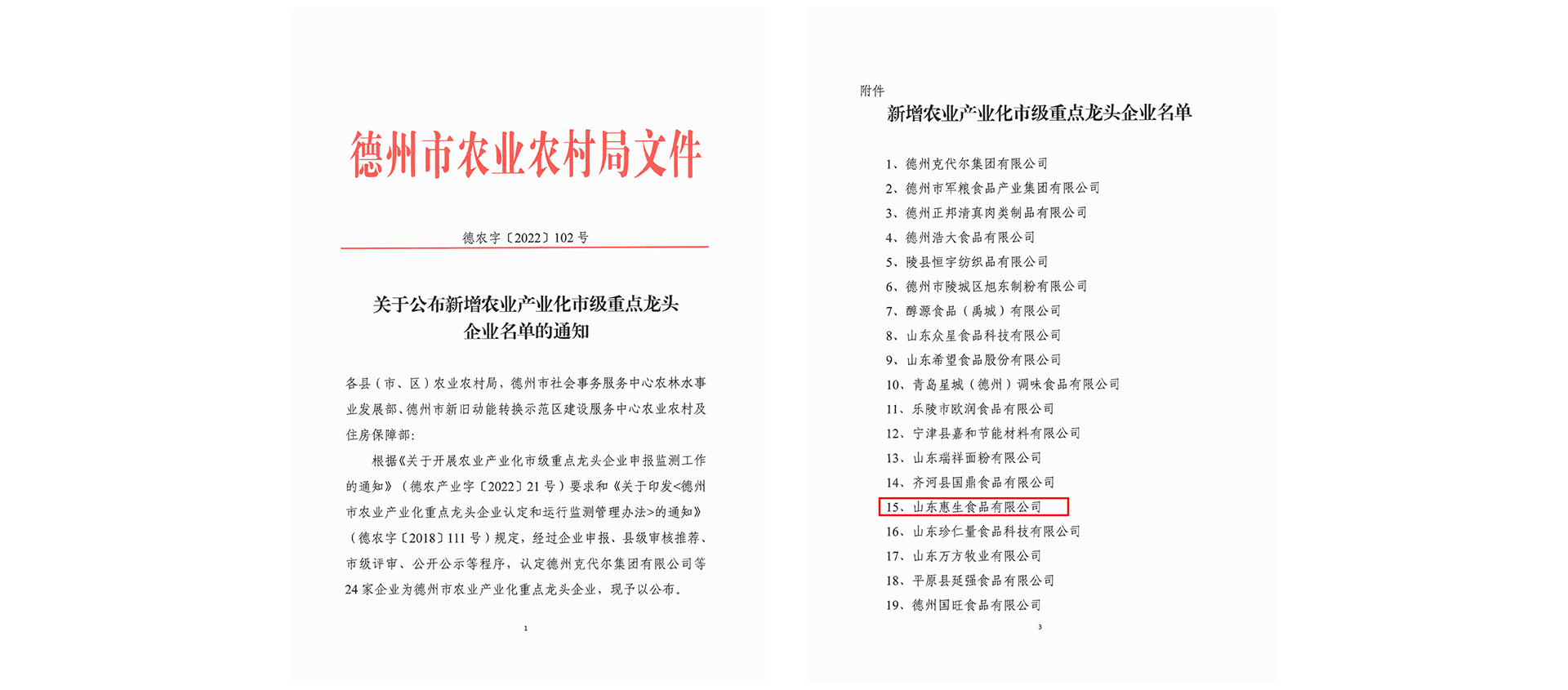 近日,山東惠生食品有限公司先后獲得“山東省德州市農(nóng)業(yè)產(chǎn)業(yè)化重點龍頭企業(yè)”和“山東省畜禽屠宰企業(yè)A級”兩項榮譽稱號。